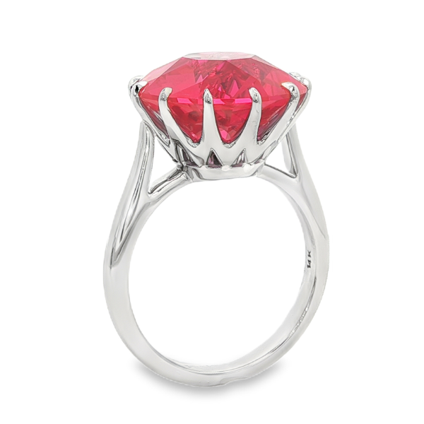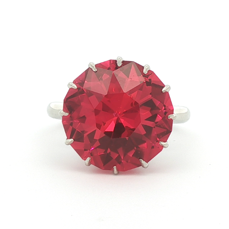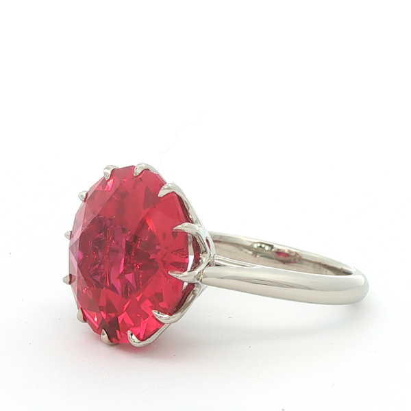 Custom 14k white gold ring set with a 15mm round synthetic ruby in a twelve claw prong crown setting.